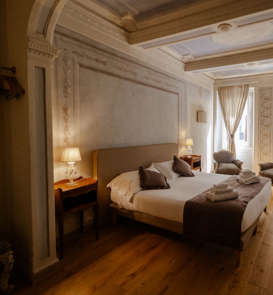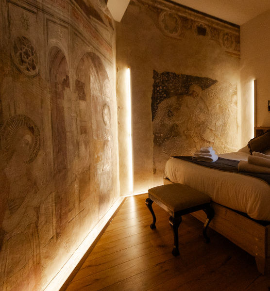 La camera Stucchi è una matrimoniale che fa parte della zona settecentesca della struttura. Le decorazioni in gesso e le raffinate pitture, che incorniciano soffitto a stanza, danno il nome alla camera. Un arco, posto al centro dell’ampia stanza, di ben 22mq più il bagno, conferisce particolare eleganza architettonica e recita un verso del cantico “Nunc dimittis” del Vangelo secondo Luca: “custodi nos dormientes”. Il letto matrimoniale è all'occorrenza divisibile per uso singolo.
