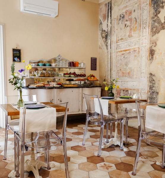 La sala colazioni è composta da due stanze adiacenti alla cucina che fanno parte della struttura trecentesca dell’immobile. Contornati da affreschi della Scuola dell’Orcagna, potrete consumare la vostra colazione tipicamente italiana, con un occhio di attenzione alle classiche necessità internazionali. Il restauro delle scene di vita di San Lorenzo e di San Girolamo vi introdurranno, al risveglio, nella vostra giornata alla scoperta della magnificenza storica della città.