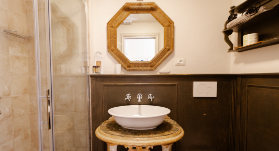 Questa camera, di ben 24mq, si affaccia su Via Santa Maria, strada che ospita il prestigioso e storico Teatro Goldoni, ex convento di Annalena.
