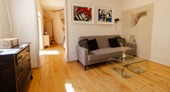 Donnant sur une cour intérieure, la chambre peut accueillir deux personnes. Le lit double, de style Louis XVI, est la pièce maîtresse de l'ameublement d'époque du XVIIIe siècle, qui confère à l'habitation confort et élégance.