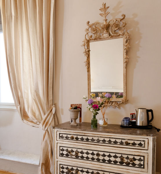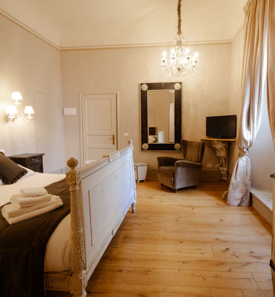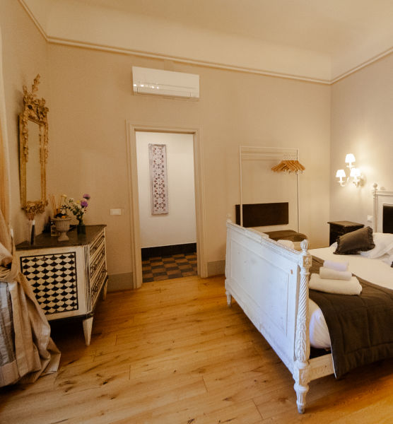 La camera si affaccia su una corte interna e può ospitare due persone. Il letto matrimoniale, in stile Luigi XVI corona l'arredamento, d'epoca settecentesca, che rende l'abitazione confortevole ed elegante.